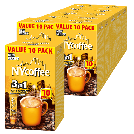 Save money with our bulk purchase offer of NY Vanilla Instant White Coffee with Sugar 3 in 1 case of 100 sachets. (10 boxes)